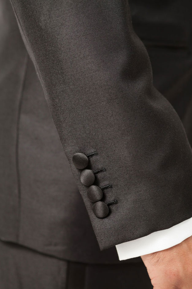 Fabric–covered sleeve buttons of a bespoke dinner jacket.