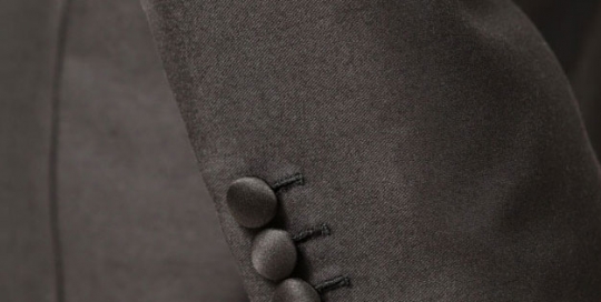 Fabric–covered sleeve buttons of a bespoke dinner jacket